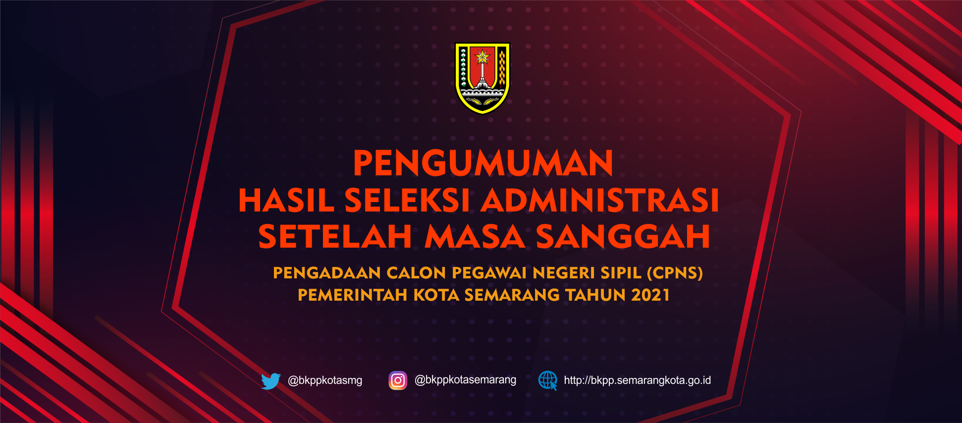 Berikut ini kami sampaikan Pengumuman Nomor : B/810/011/2021 tentang Hasil Seleksi Administrasi Setelah Masa Sanggah Pengadaan Calon Pegawai Negeri Sipil (CPNS) Pemerintah Kota Semarang Tahun 2021.