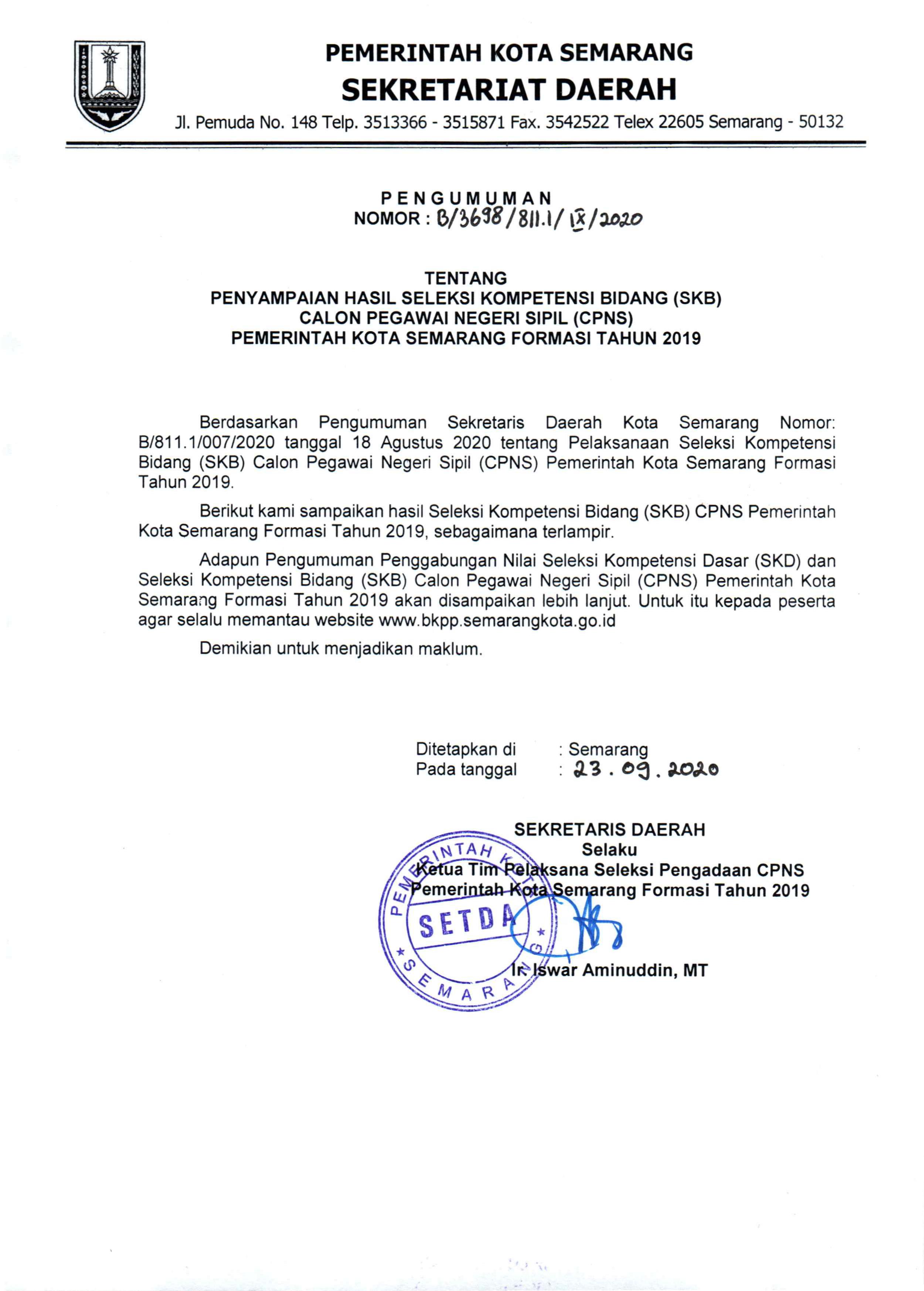 [ Update ] Pengumuman Penyampaian Hasil Seleksi Kompetensi Bidang Calon Pegawai Negeri Sipil Pemerintah Kota Semarang Formasi Tahun 2019