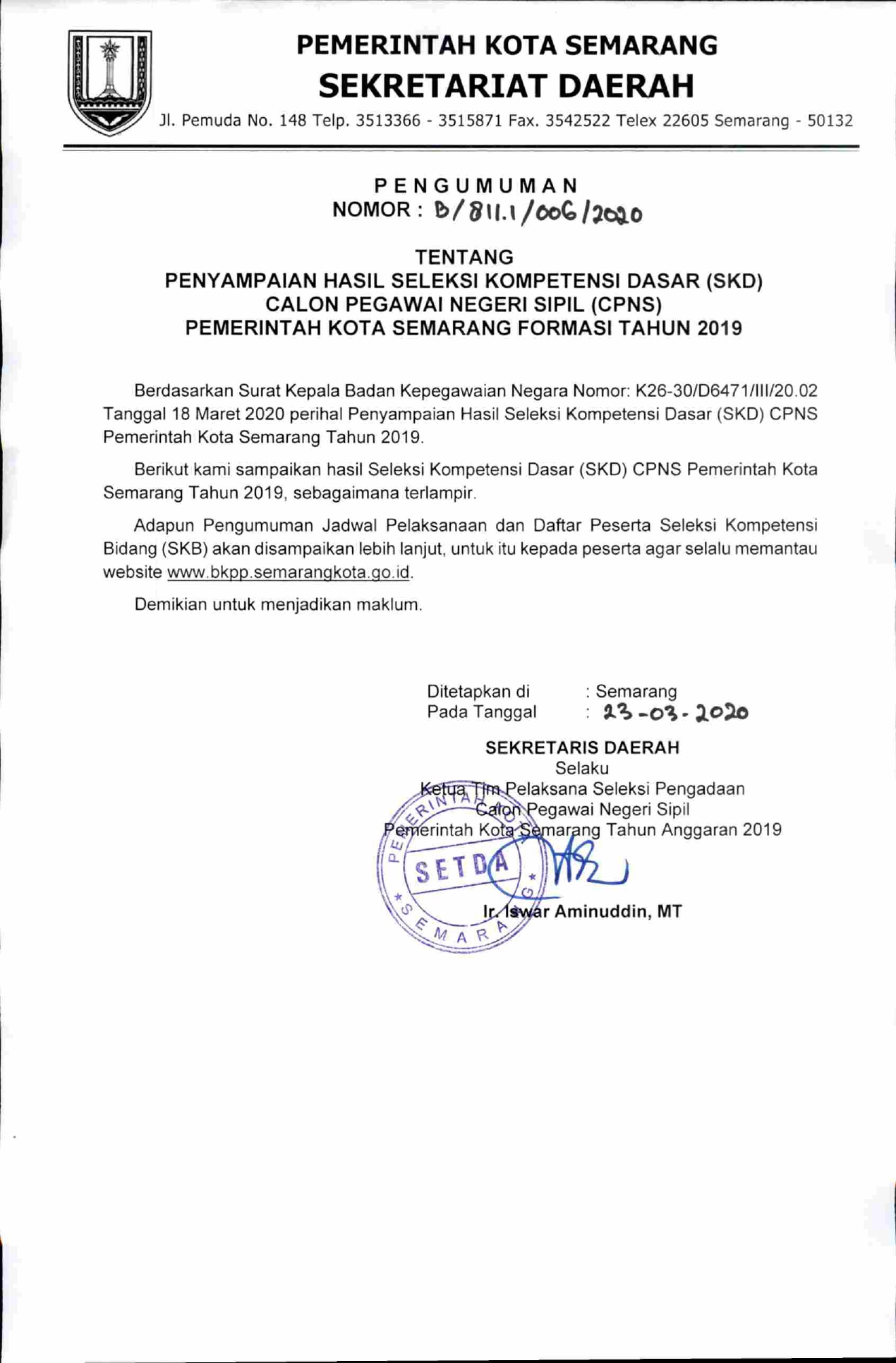 Berikut ini kami sampaikan Pengumuman Nomor : B/811.1/006/2020 tentang Penyampaian Hasil Seleksi Kompetensi Dasar (SKD) Calon Pegawai Negeri Sipil (CPNS) Pemerintah Kota Semarang Formasi Tahun 2019.