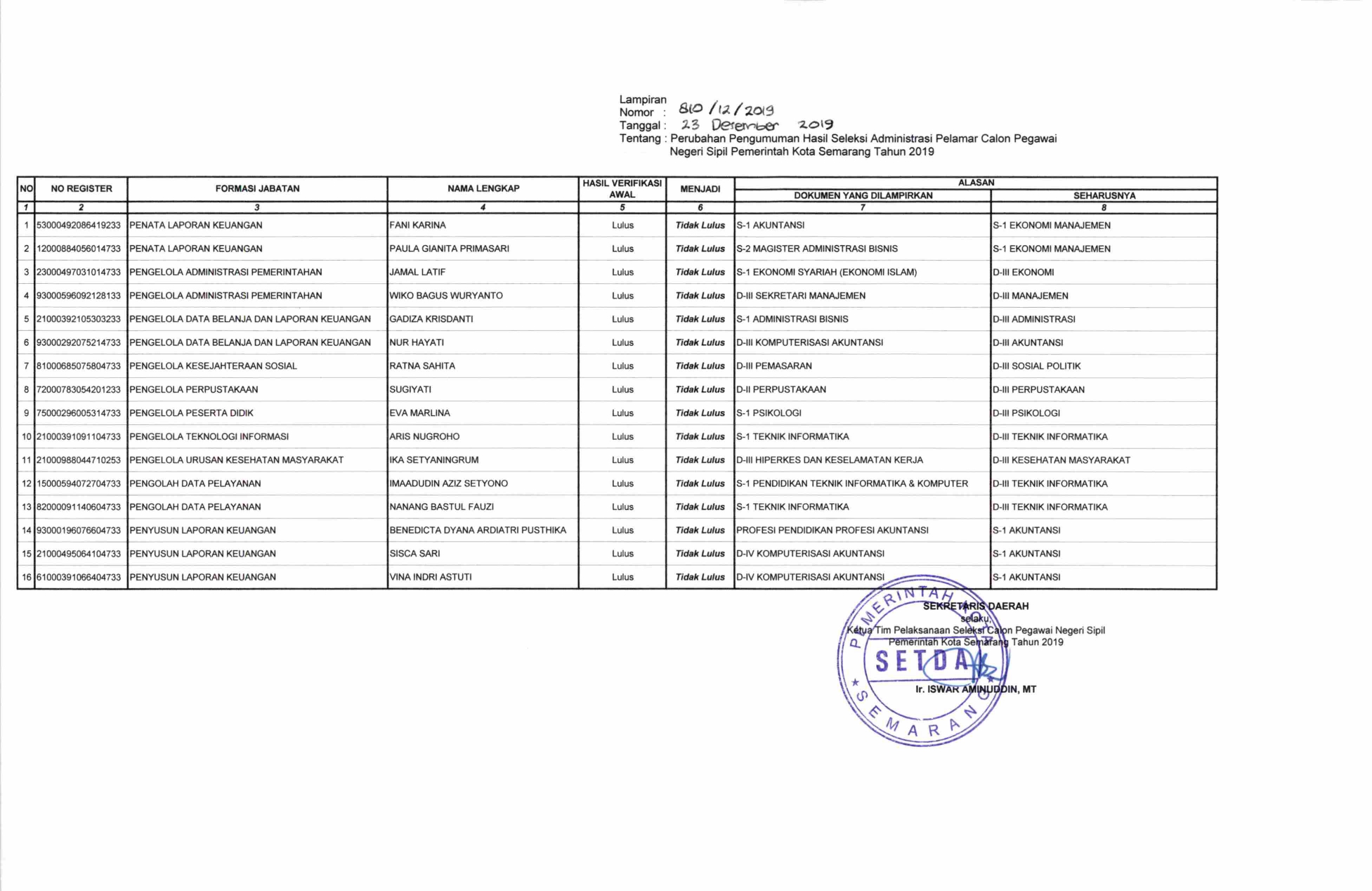 Perubahan Pengumuman Hasil Seleksi Administrasi Pelamar Calon Pegawai Negeri Sipil Pemerintah Kota Semarang Tahun 2019