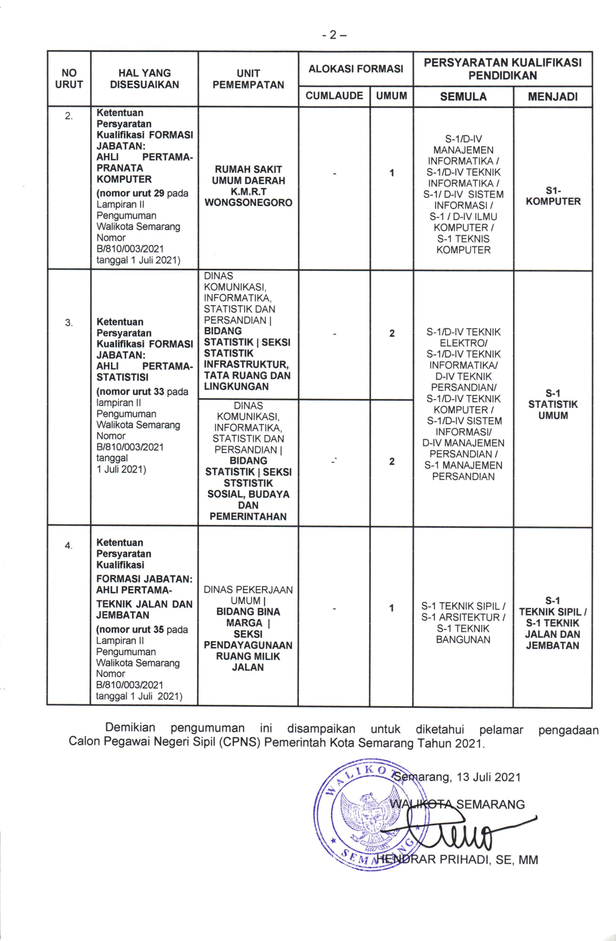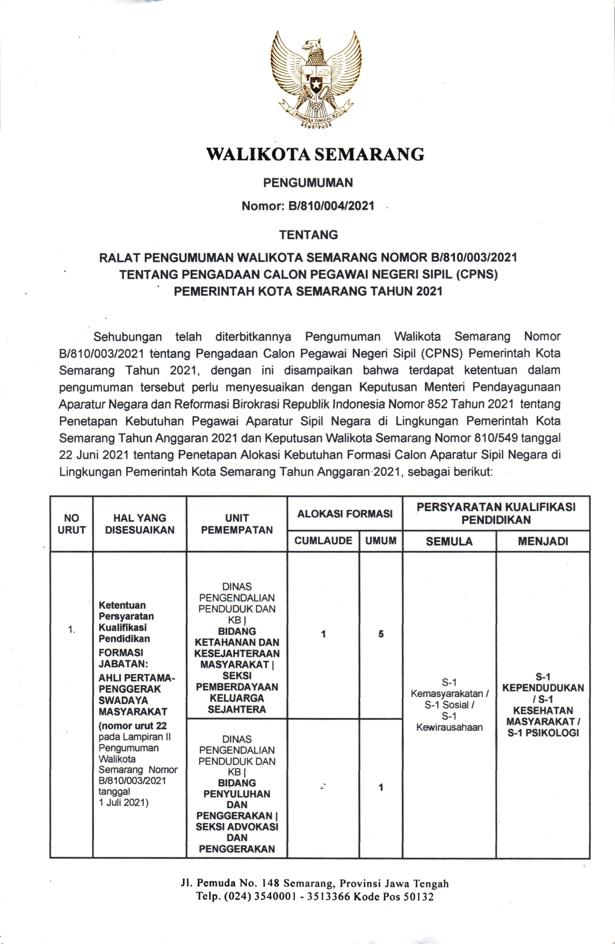 Sehubungan telah diterbitkannya Pengumuman Walikota Semarang Nomor B/810/003/2021 tentang Pengadaan Calon Pegawai Negeri Sipil (CPNS) Pemerintah Kota Semarang Tahun 2021, dengan ini kami sampaikan bahwa terdapat ketentuan dalam pengumuman tersebut perlu menyesuaikan dengan Keputusan Menteri Pendayagunaan Aparatur Negara dan Reformasi Birokrasi Republik Indonesia Nomor 852 Tahun 2021 dan Keputusan Walikota Semarang Nomor 810/549 tanggal 22 Juni 2021, sebagai berikut :