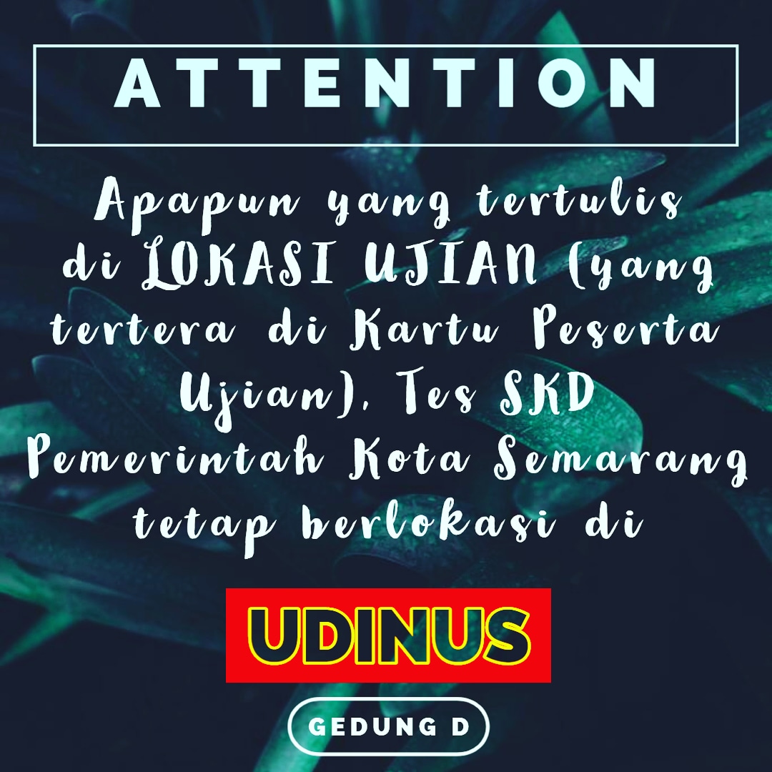 Mengingatkan kembali kepada seluruh Peserta Seleksi Kompetensi Dasar (SKD) Calon Pegawai Negeri Sipil (CPNS) Pemerintah Kota Semarang Formasi Tahun 2019 bahwa lokasi tes SKD diselenggarakan di :